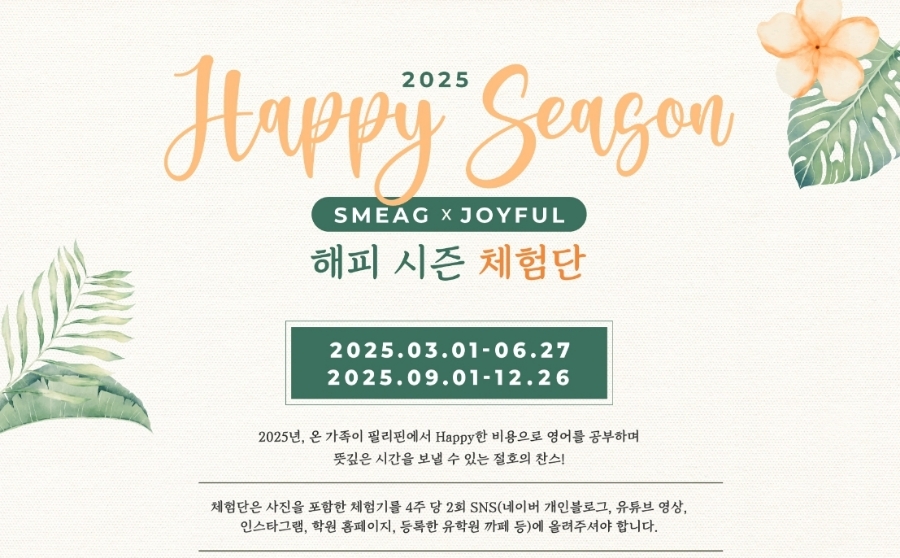 금일은 점점 방학기간이 다가옴에 따라 필리핀 세부 가족연수 Smeag 엔칸토 가족연수 비수기 가족연수 체험단 모집 소식 전하도록 하겠습니다.